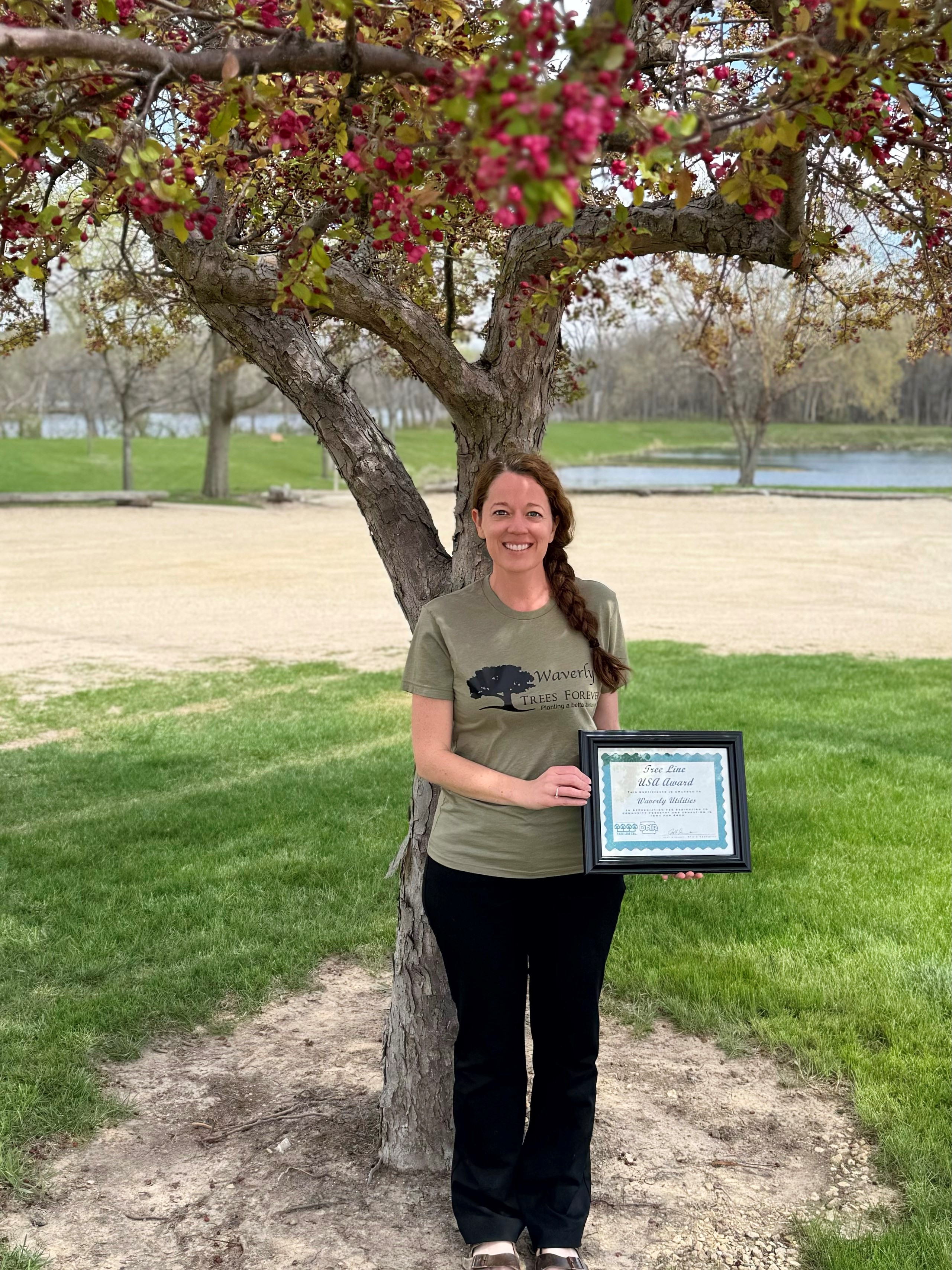 Customer Relations Supervisor, Amber Stephens, with the Tree Line USA award. |