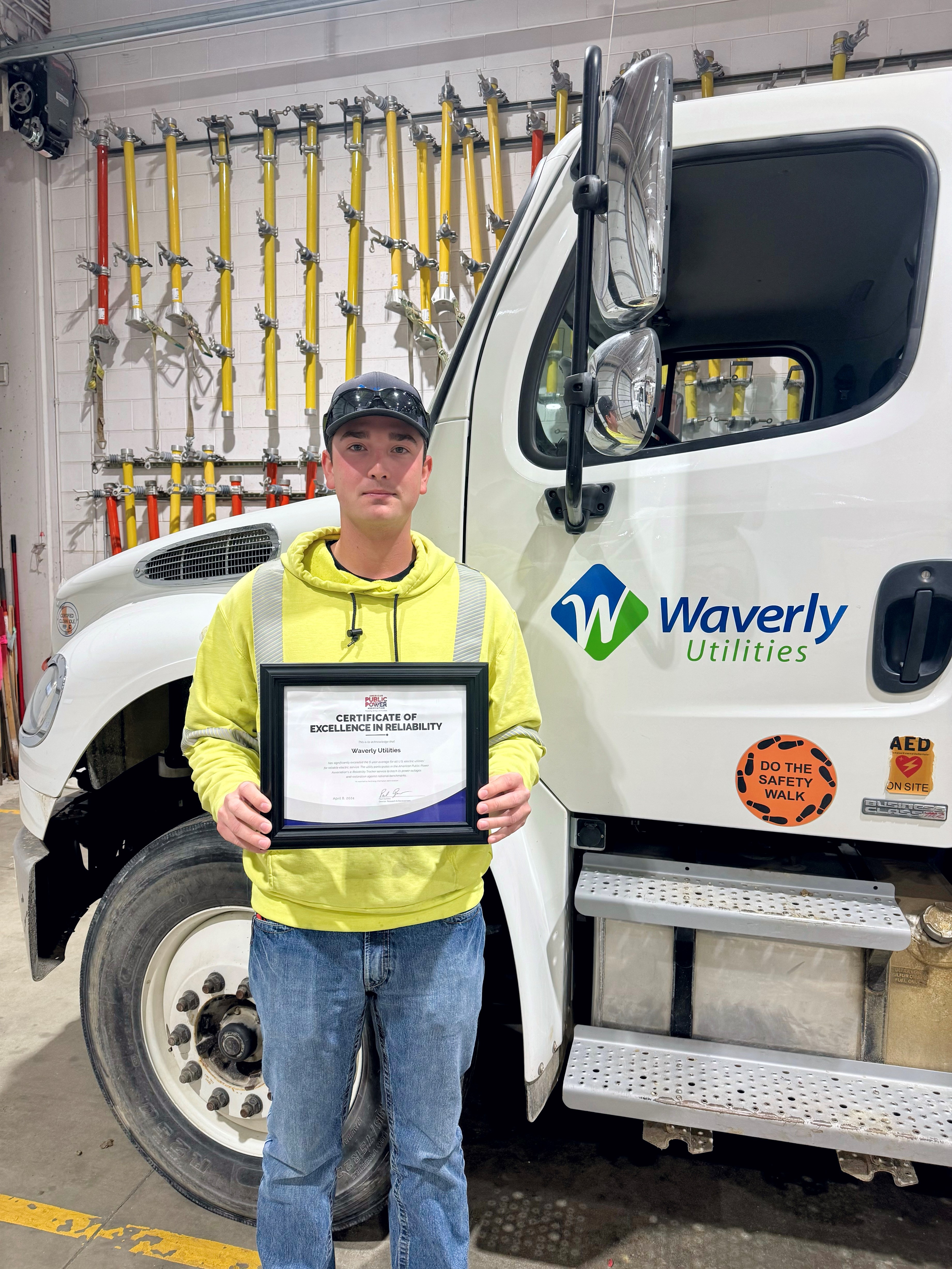 Apprentice Lineman Cody Metcalf with the Certificate of Excellence in Reliability award. |